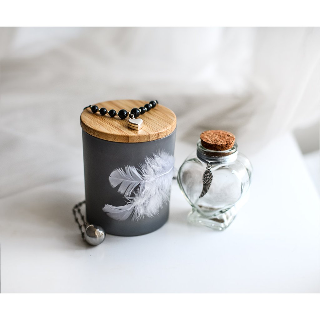 Sklenička je doplněná saténovou šňůrkou a kovovým přívěskem ve tvaru křídla, který jemně podtrhuje vzpomínkový charakter předmětu. Uzavírá se korkovým víčkem.