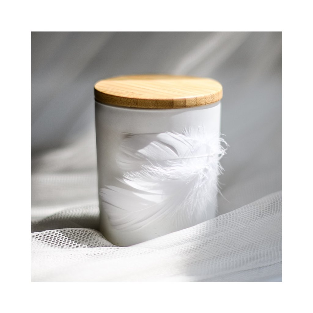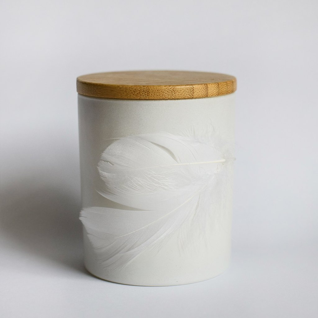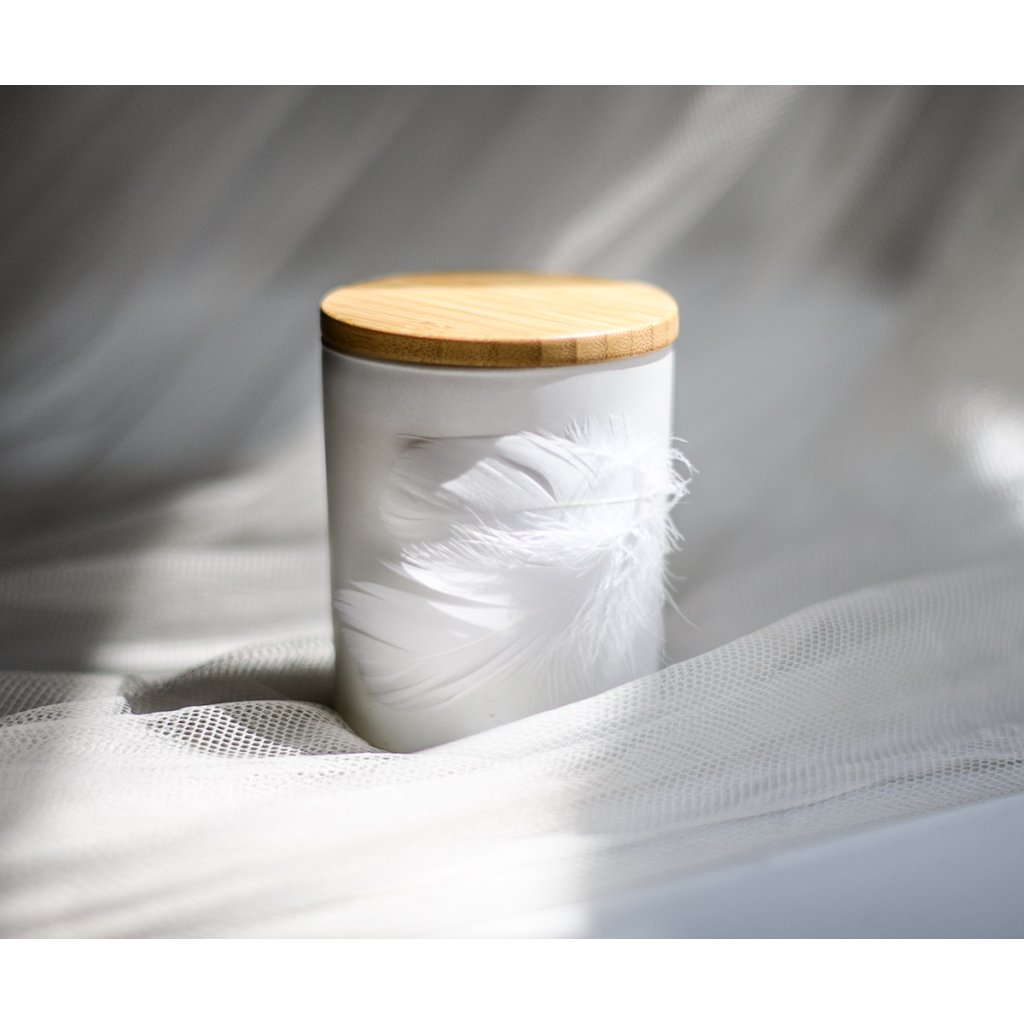 Bílá svíčka s dřevěným knotem, dvěma pírky a dvěma přírodními krystaly. Navržena jako klidný doplněk pro pietní místo nebo osobní vzpomínku.