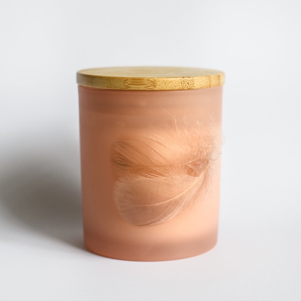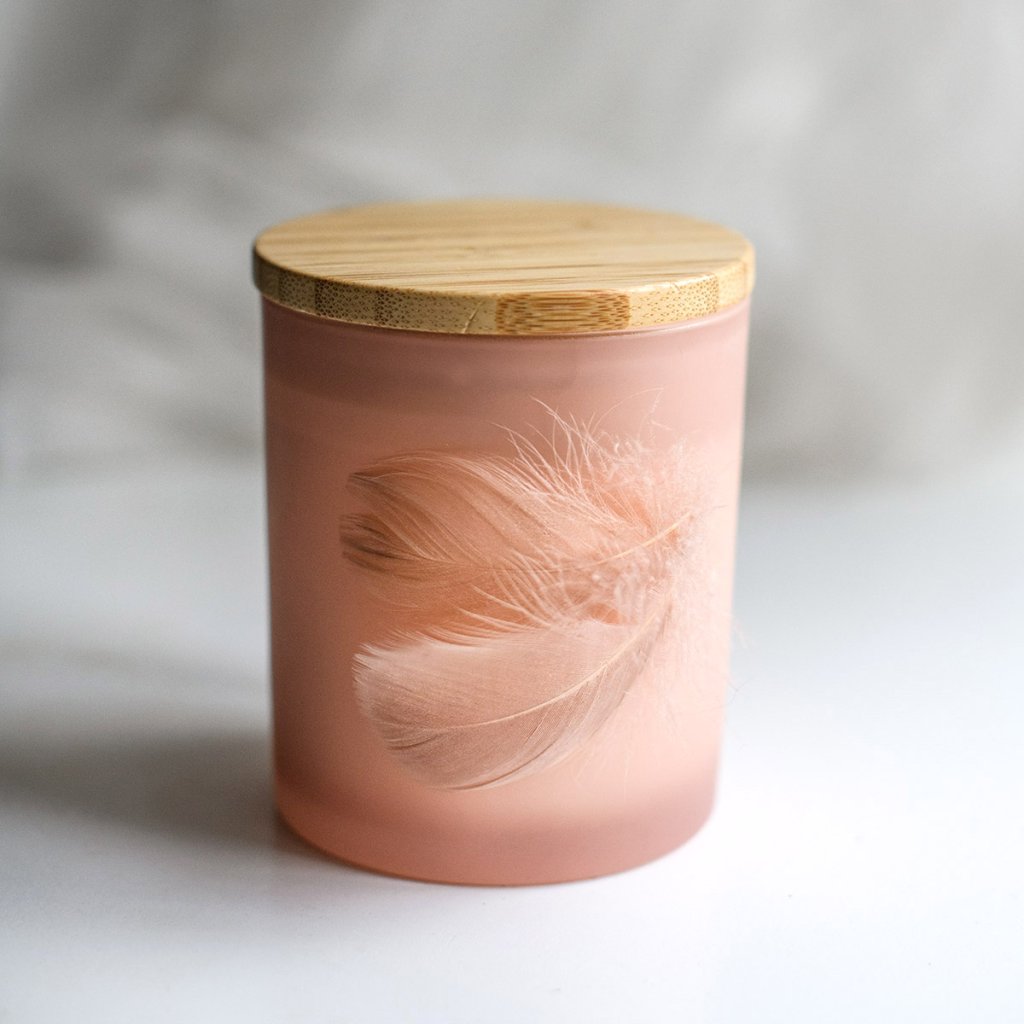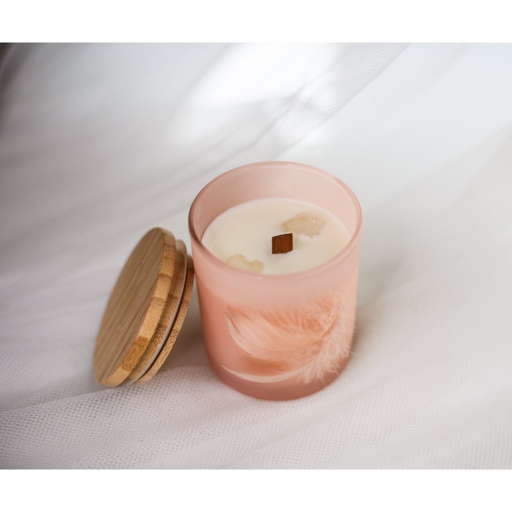 Růžová svíčka s dřevěným knotem, dvěma pírky a dvěma přírodními krystaly. Navržena jako klidný doplněk pro pietní místo nebo osobní vzpomínku.