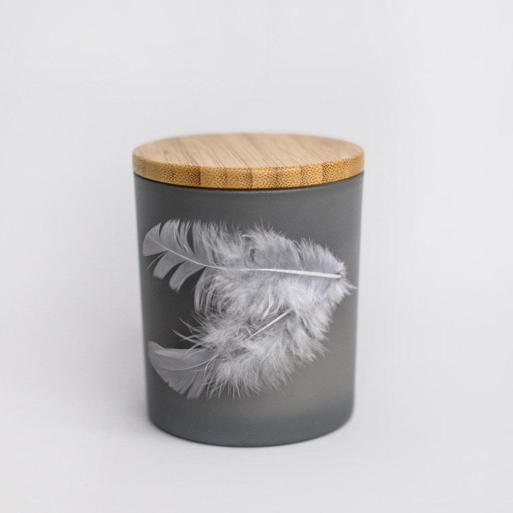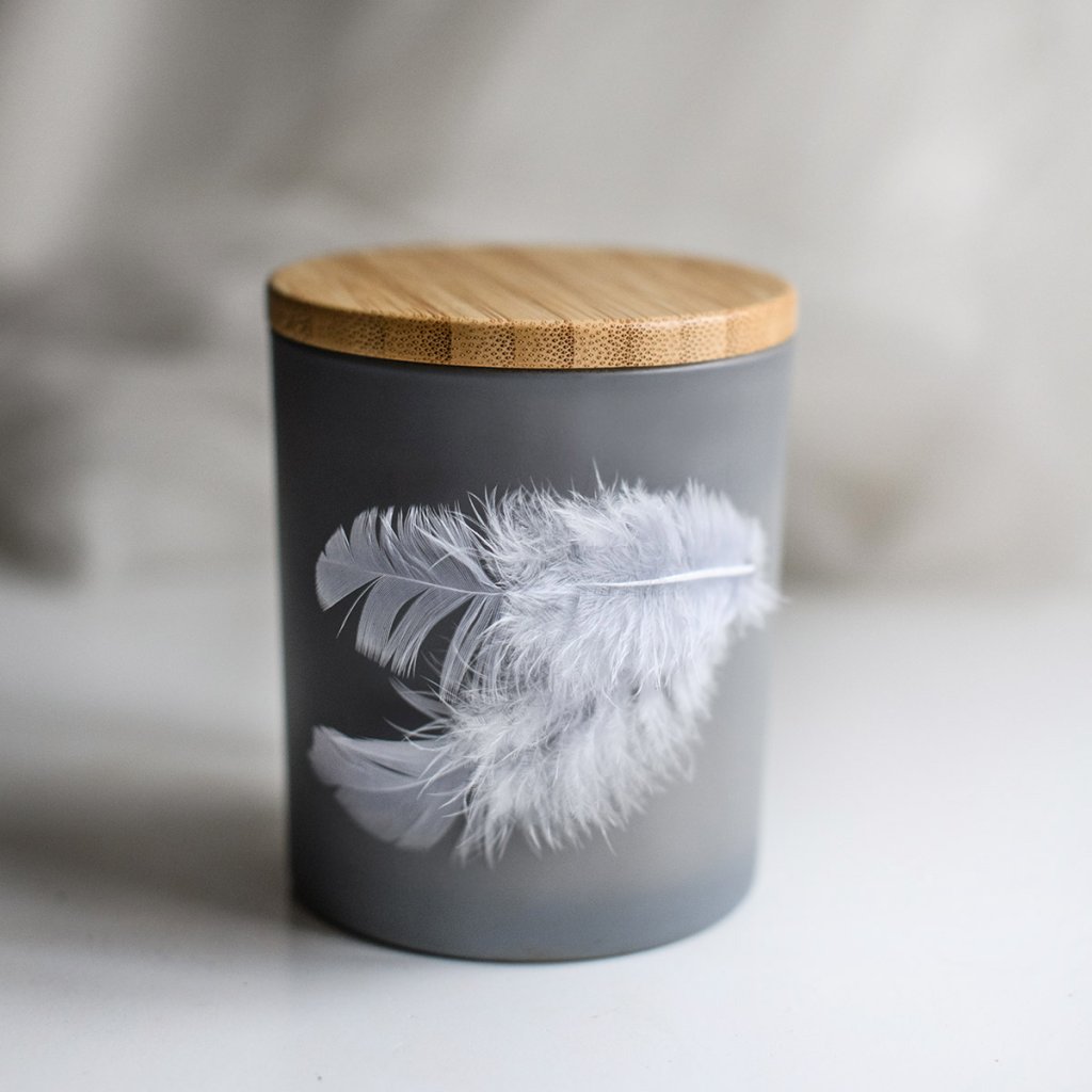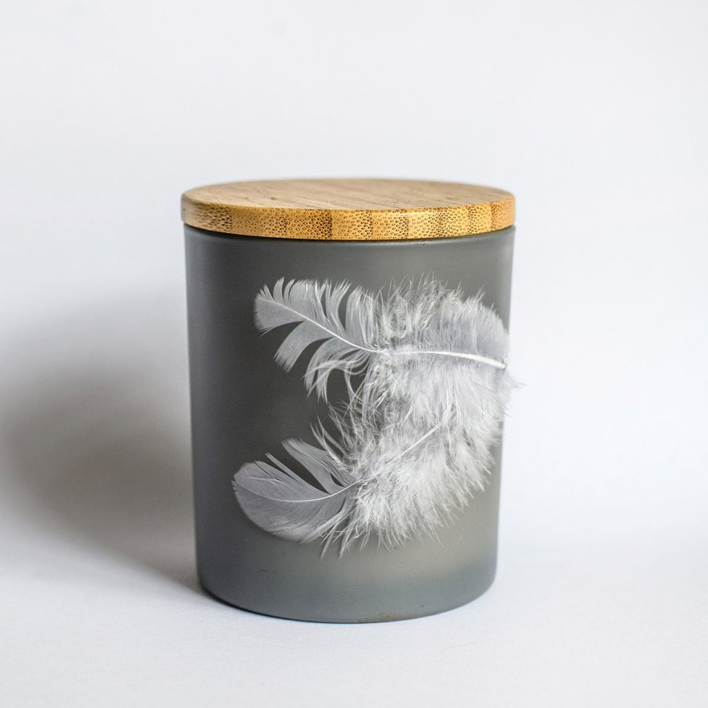 Šedá svíčka s dřevěným knotem, dvěma pírky a dvěma přírodními krystaly. Navržena jako klidný doplněk pro pietní místo nebo osobní vzpomínku.