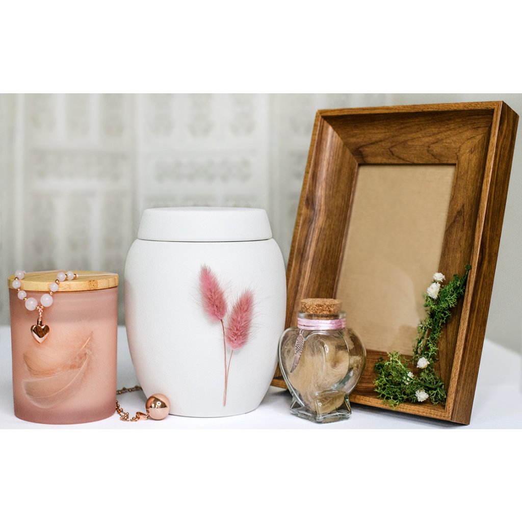 Dekorace: bez / se sušeným lagurusem (bílý, šedý, růžový). Urna je doplněna saténovým pytlíkem pro uložení popela.