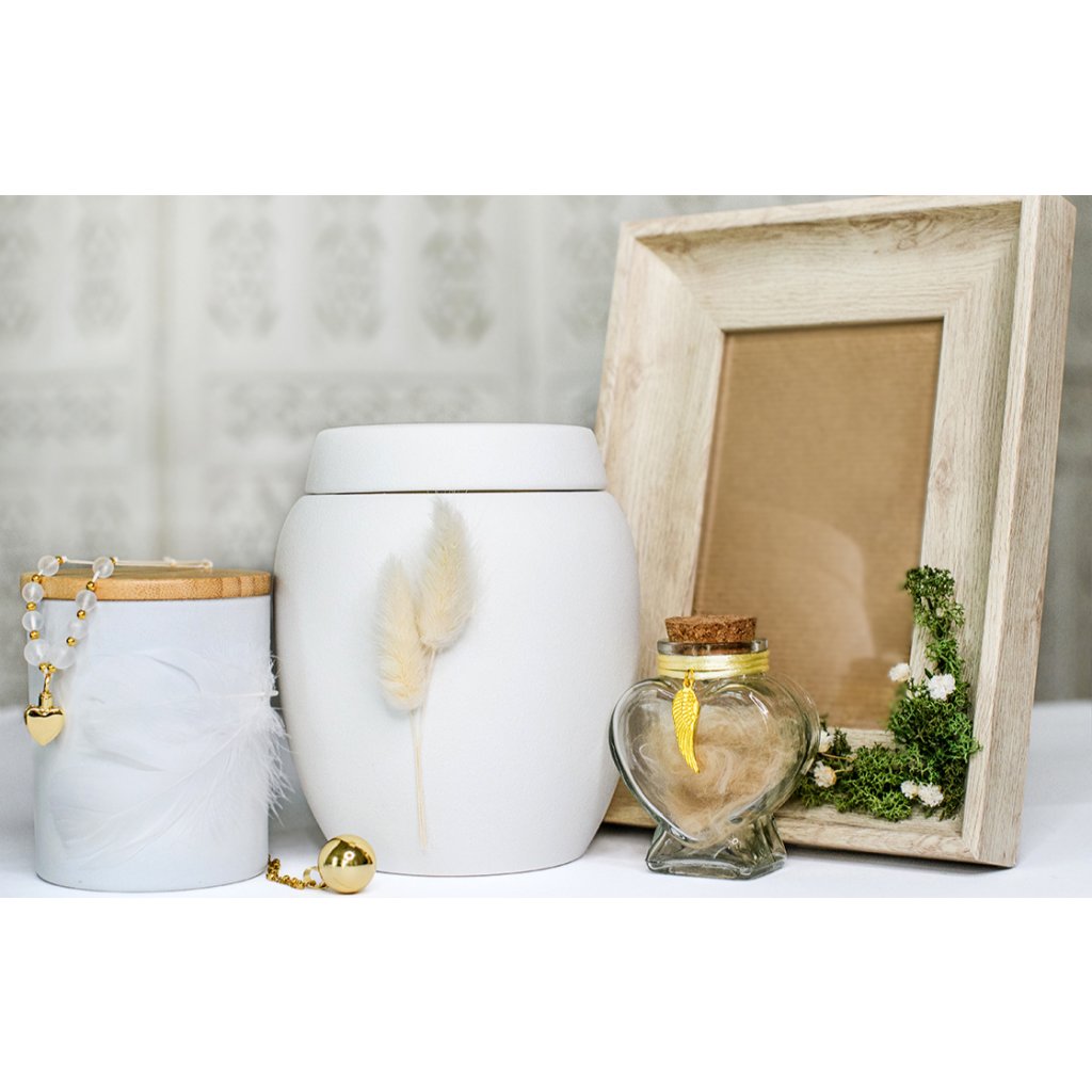Dekorace: bez / se sušeným lagurusem (bílý, šedý, růžový). Urna je doplněna saténovým pytlíkem pro uložení popela.